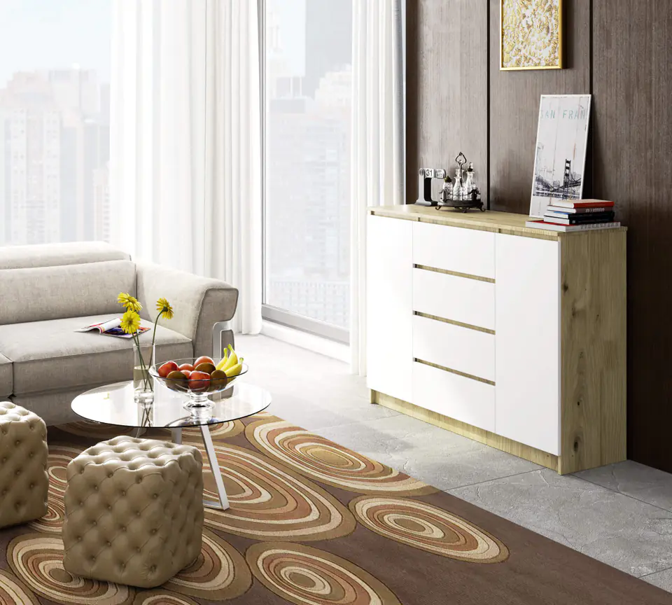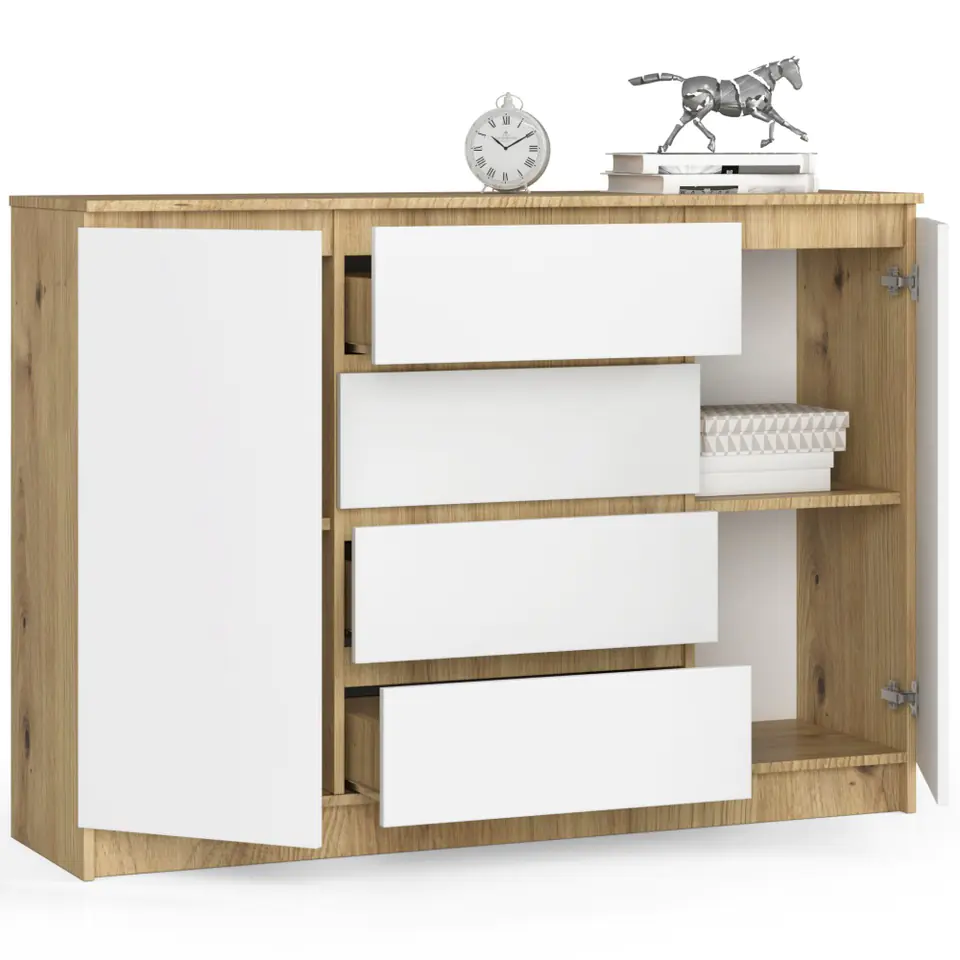 - Komoda wykonana z wysokogatunkowej płyty laminowanej 16mm odpornej na ścieranie, producent kronospan- Fronty szuflad wykonane z płyty laminowanej- Szuflady poruszają się na metalowych prowadnicach rolkowych