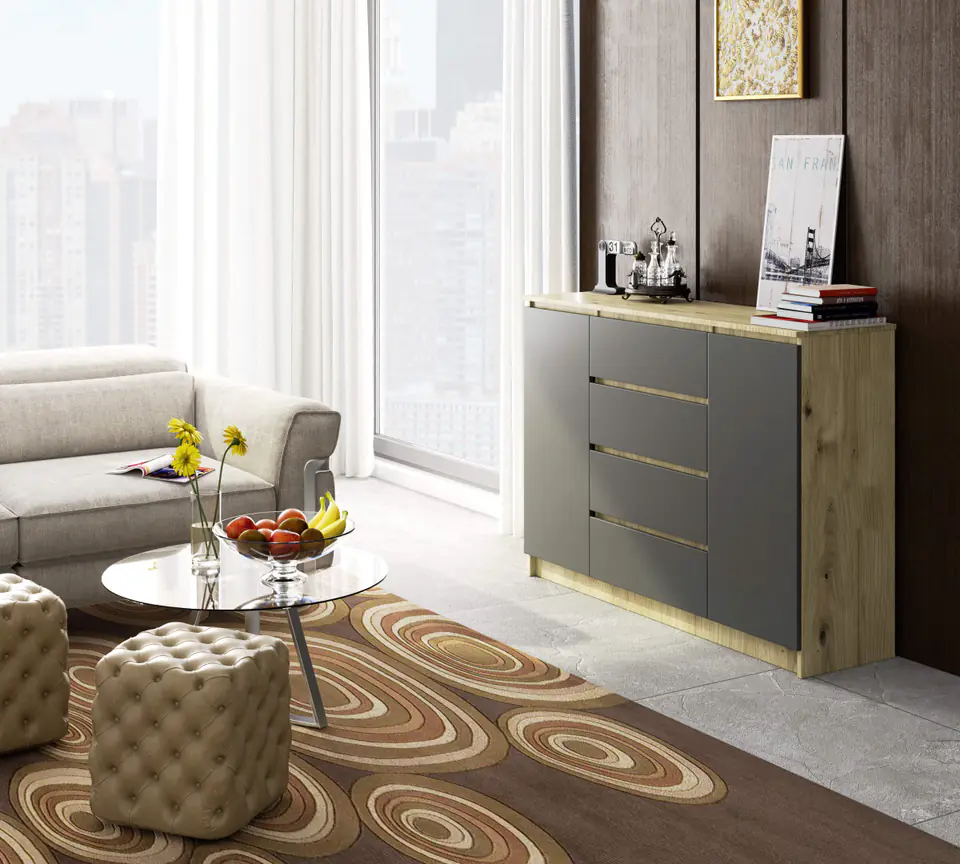 - Komoda wykonana z wysokogatunkowej płyty laminowanej 16mm odpornej na ścieranie, producent kronospan- Fronty szuflad wykonane z płyty laminowanej- Szuflady poruszają się na metalowych prowadnicach rolkowych