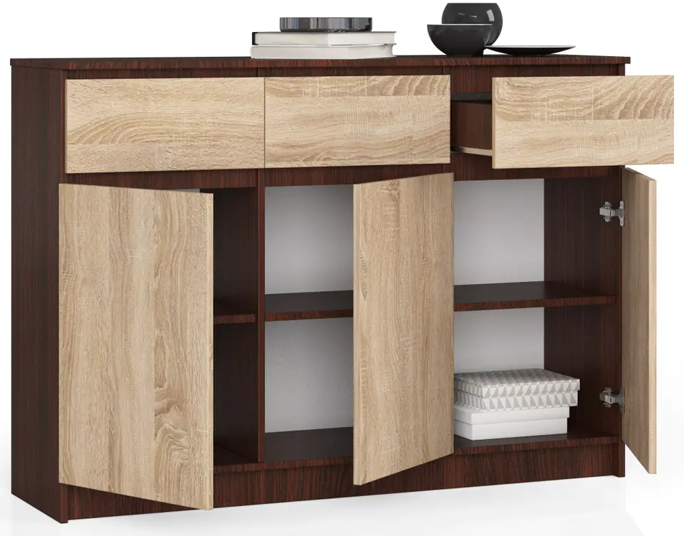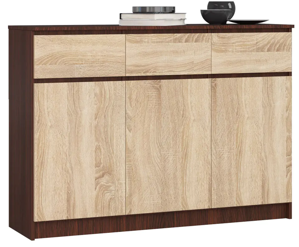 Komoda K 140 została wykonana z odpornej na ścieranie laminowanej płyty meblowej Kronospan w dwóch deseniach. Korpus mebla stanowi imitacja drewna wenge, natomiast fronty szuflad oraz drzwi utrzymano z jaśniejszym odcieniu dębu sonoma. Mebel podzielono wizualnie w pionie na 3 równe części. Pod blatem komody znajdują się równolegle 3 pojedyncze szuflady. Pod każdą szuflad umieszczono drzwiczki szafek. Po ich otwarciu, wewnątrz komody widoczne są wyodrębnione 3 szafki, każda zaopatrzona w 2 półki o równej wielkości. Szuflady wysuwają się dzięki metalowym prowadnicom rolkowym.
