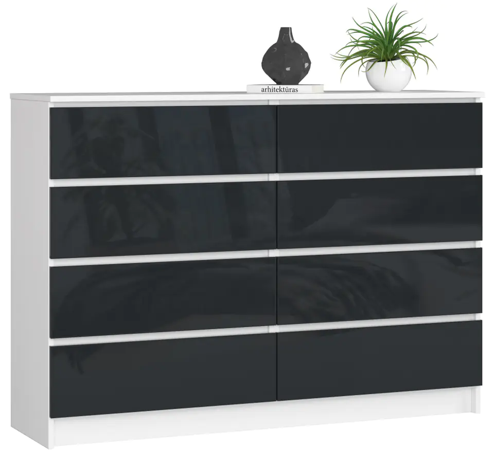Komoda biała / grafit, wysoki połysk wyróżnia się nieszablonowym designem i bardzo praktyczną konstrukcją. Wyposażona jest aż w 8 przestronnych szuflad, które mogą pomieścić duże ilości garderoby lub różnych przedmiotów domowego użytku. Takie rozwiązanie jest nie tylko praktyczne, ale i wygodne. Komoda stwarza duże możliwości przechowywania, co pozwala na zachowanie idealnego porządku w pomieszczeniu.
