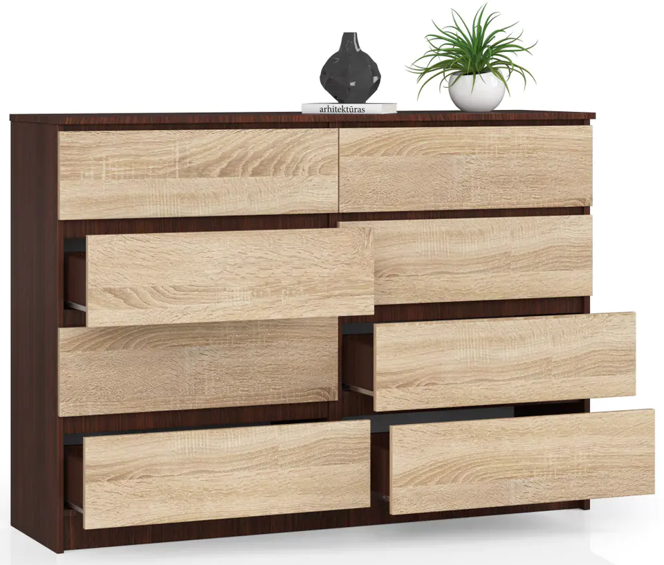 Oferujemy wykonaną z 16 mm laminowanej płyty odpornej na ścieranie komodę - model K140 z 8 szufladami. Wysoka jakość wykonania, zastosowane materiały oraz dbałość o szczegóły, przejawiająca się m.in. w oklejeniu krawędzi komody obrzeżem ABS sprawia, iż mebel ten sprawdza się doskonale w każdym pomieszczeniu i świetnie komponuje się z każdą aranżacją, a dodatkowo zapewnia wysoką odporność odporność na uszkodzenia mechaniczne. W wykonaniu komody zastosowano system Mebli CLP, stanowiący obszerną gamę mebli do salonu i sypialni, pozwalający na efektywne urządzenie mieszkania niskim kosztem.Komoda została przeznaczona do samodzielnego montażu i ma wymiary całkowite:- długość – 138 cm,- wysokość - 99 cm,- głębokość – 40 cm.Dołączona do mebla instrukcja montażu, została sporządzona w prosty i przystępny sposób, dodatkowo szczegółowe oznaczenie każdego elementu mebla pozwana na proste i beznarzędziowe złożenie komody.Dla wygody użytkowników i zwiększenia pojemności mebla, komodę zaprojektowano tak, by miała 8 niezależnych szuflad. Poruszających się na metalowych prowadnicach rolkowych.Wychodząc naprzeciw oczekiwaniom klientów, komoda została zaprojektowana w trzech możliwych kolorach:- Wenge,- Dąb,- Sonoma.Zróżnicowana gama kolorystyczna pozwala na wkomponowanie mebla w wystrój każdego wnętrza.Ponieważ dokładamy należytej staranności do każdego szczegółu produkowanych przez nas mebli oraz stawiamy na wysoką jakość usług, prezentowana komoda objęta jest 24 – miesięczną gwarancją.