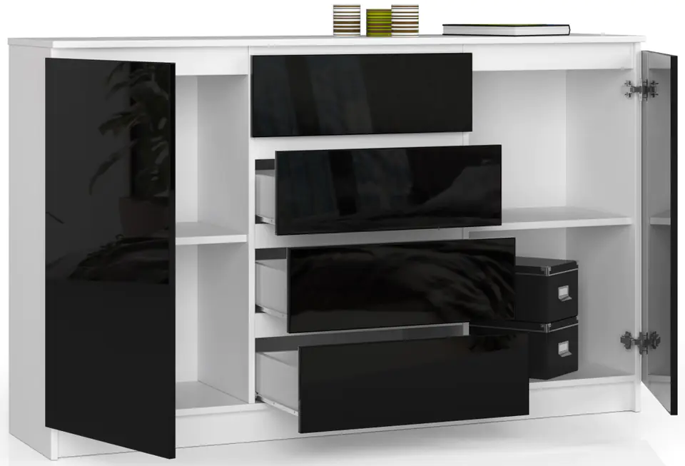 Komoda K 160 cm to mebel o wyjątkowych walorach wizualnych. Uniwersalna czerń frontów wykończonych połyskiem idealnie harmonizuje z półmatem korpusu. Monochromatyczna kolorystyka świetne się sprawdzi we wnętrzach urządzonych w nowoczesnej, minimalistycznej stylistyce, takich jak salon, sypialnia czy pokój młodzieżowy.