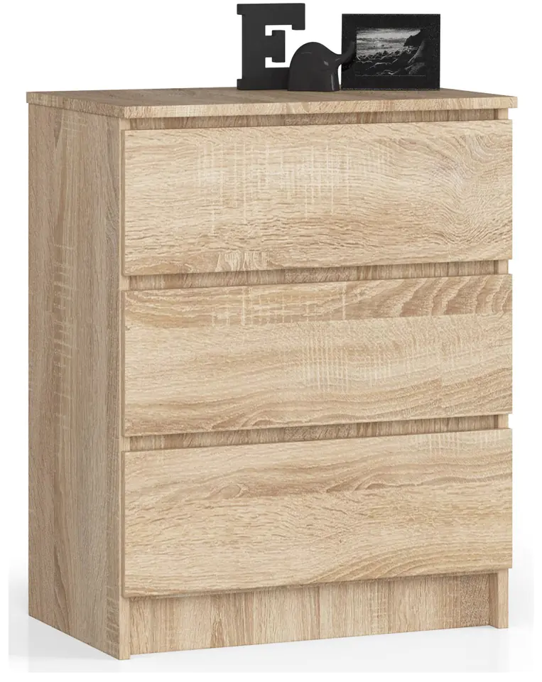 Niewielka lecz pojemna komoda z trzema szufladami, której wykończenie spełni oczekiwania wymagających. Wykorzystano tutaj dąb sonomę, barwę idealnie pasującą do jasnych wykończeń wnętrz. Produkt trafi do sypialni, salonu, pokoju czy przedpokoju - wszystko zależy od potrzeb naszych klientów. Proponujemy egzemplarz wykonany z płyty laminowanej o grubości aż 16 milimetrów. Jest to materiał odporny na ścieranie, który dodatkowo wzmocnionono obiciem ABS na obrzeżach. W modelu zastosowano szuflady poruszające się na metalowych prowadnicach kulkowych, co przekłada się na płynne, delikatne i precyzyjne działanie.