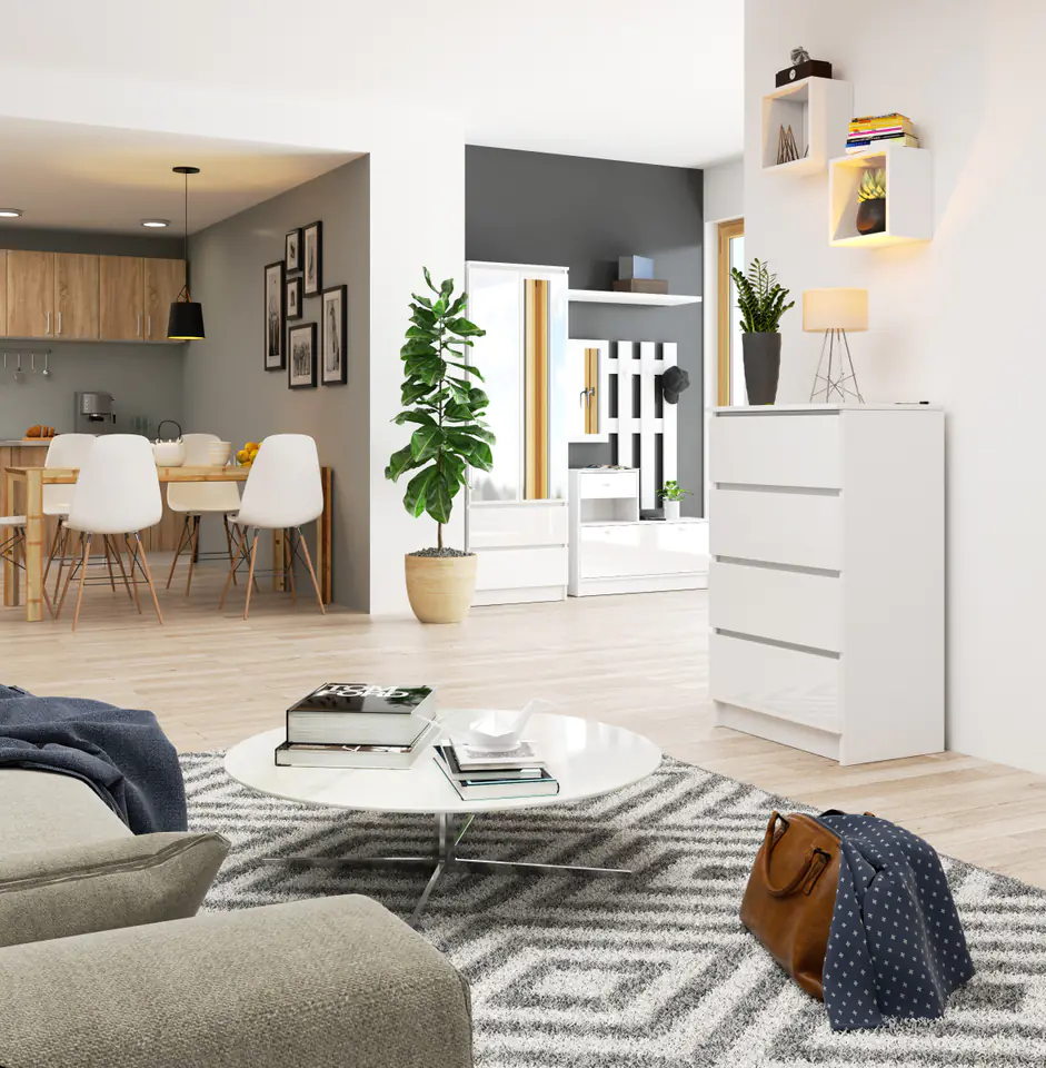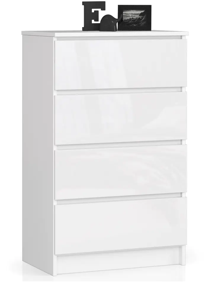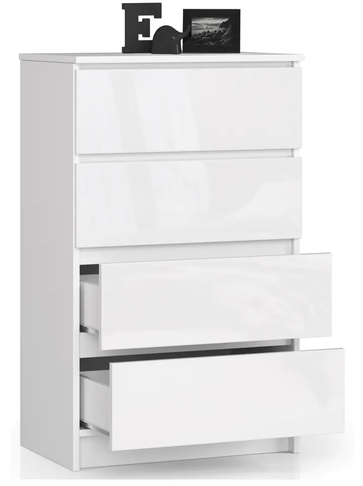Komoda K 60 cm w kolorze białym to prosty, ale elegancki mebel, który wyróżnia się ponadczasowym charakterem. Uniwersalny design pozwala na zastosowanie w każdym, dowolnie wybranym pomieszczeniu - pokoju dziennym, młodzieżowym, dziecięcym, sypialni, jadalni, korytarzu czy wnętrzu biurowym. Szafka została wyposażona w cztery pojemne szuflady, które otwierają się oraz zamykają w prosty sposób. Białe, akrylowe fronty w wysokim połysku cieszą się uznaniem klientów, dla których liczą się zarówno walory wizualne wybieranych produktów, jak i ich wysoka jakość.