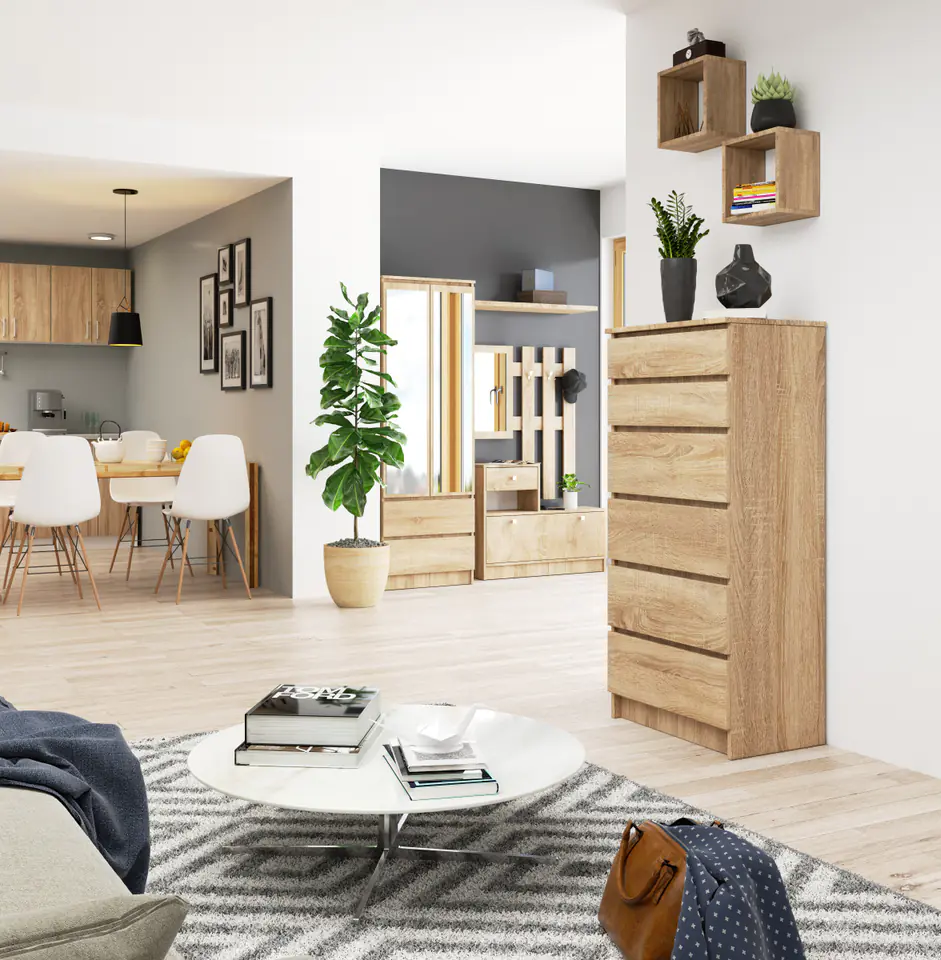 Bezuchwytowe fronty podkreślają ducha minimalizmu, w którym została wykonana komoda. Zastosowanie płyty meblowej we wzorze Dąb Sonoma o grubości 16 mm, z wykończeniem okleiny ABS w tym samym stylu oprócz zapewnienia trwałości oraz ochrony przed wnikaniem wilgoci, nadaje bardzo modernistyczny charakter. Dzięki temu komoda ta świetnie się odnajdzie w pomieszczeniach nowoczesnych i dobrze oświetlonych. Wraz z innymi meblami, wykorzystującymi stonowane kolory oraz prostotę wykonania sprawdzi się we wnętrzach urządzonych w stylu skandynawskim, a także dziecięcych czy młodzieżowych.