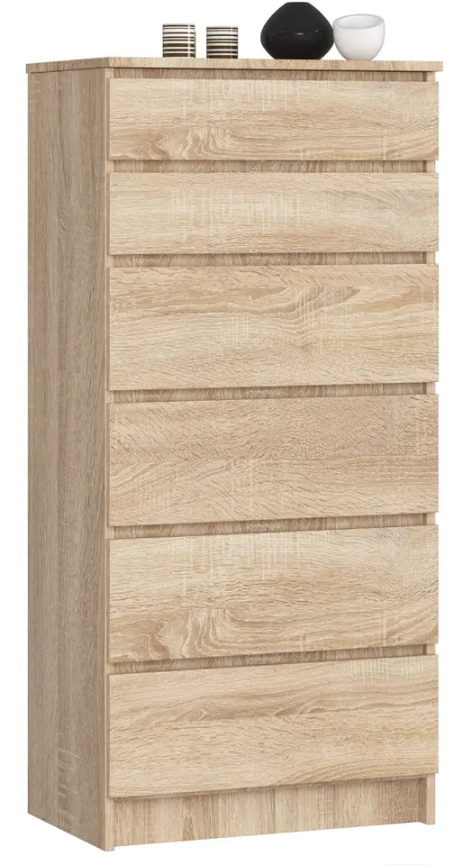 Komoda K60 stanie się Twoim pomocnikiem w organizacji oraz porządkowaniu ubrań i dodatków. Posiada ona 6 szuflad, poruszających się delikatnie na metalowych prowadnicach rolkowych. Cztery dolne szuflady, z racji na swoją dużą pojemność idealnie nadadzą się na organizację ubrań, natomiast dwie górne mogą pełnić rolę organizerów, dzięki czemu to co dla Ciebie najważniejsze będziesz posiadać w zasięgu ręki.
