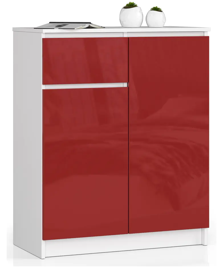 Efektowne czerwone fronty w wysokim połysku z pewnością przypadną do gustu wszystkim miłośnikom żywych, nietuzinkowych barw oraz ciekawie zaprojektowanych mebli, które na pewno doskonale ożywią każdą przestrzeń. Mebel, który prezentujemy, składa się z szuflady oraz dwóch zamykanych szafek. W każdej z nich znalazły się dwie półki przeznaczone do dowolnego zagospodarowania. Komoda K 80 cm. to połączenie białego korpusu oraz czerwonych frontów. Niewielki mebel będzie dobrze pasował do pokoju młodzieżowego lub pokoju dziennego, jednak znajdzie zastosowanie także w innych pomieszczeniach, również biurowych.