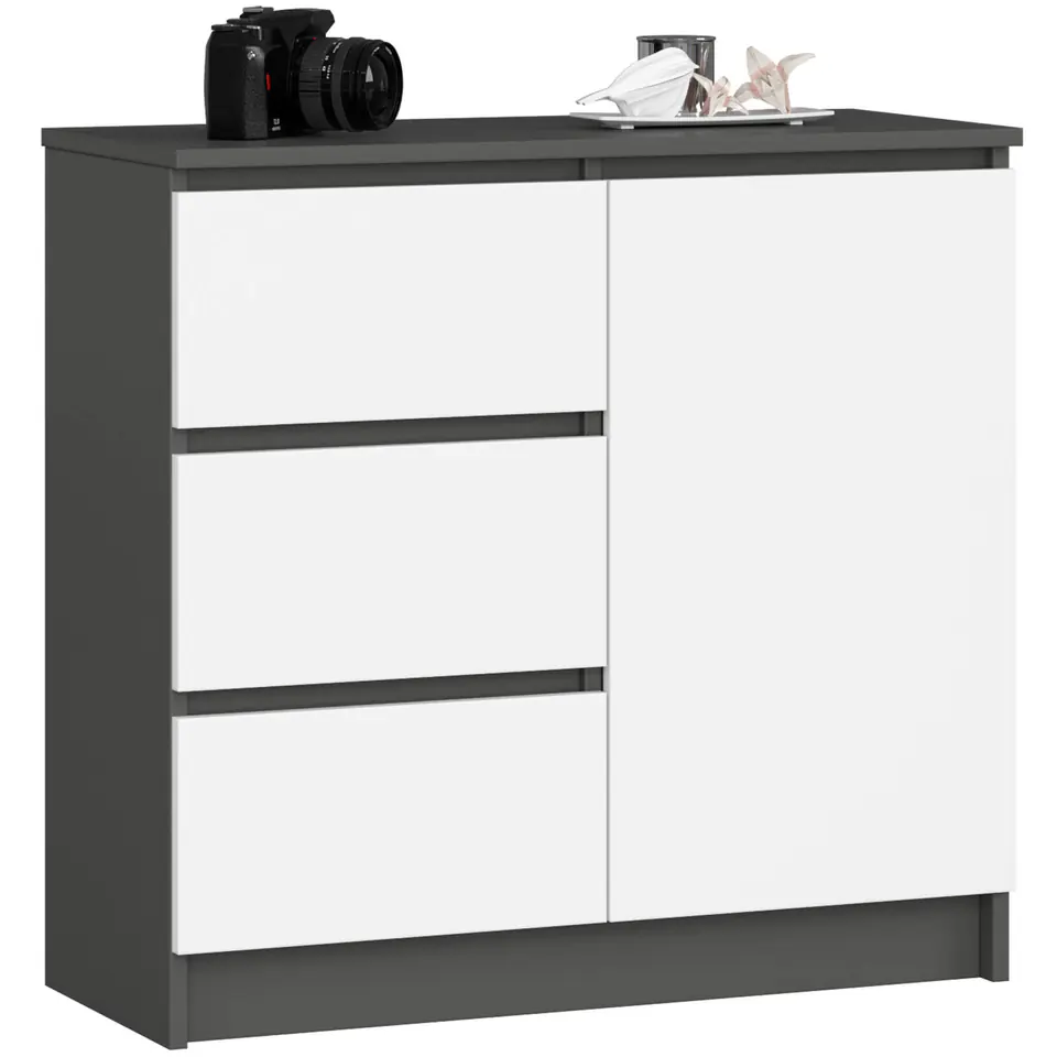 Niewielka komoda to element wyposażenia, który znajdzie zastosowanie w każdym pomieszczeniu. Nowoczesne barwy, solidna konstrukcja i staranne wykonanie zaowocowało powstaniem szafki, która sprawdzi się na przykład w przedpokoju, pokoju dziennym czy młodzieżowym, a także w sypialni. Może być wykorzystana również w pomieszczeniu biurowym, gdzie umożliwi przechowywanie licznych dokumentów oraz innych artykułów o charakterze biurowym. Komoda składa się z jednych drzwiczek (w środku znajdują się dwie półki) oraz 3 szuflad. Mebel łączy w sobie kolorystykę grafit szary i bieli.