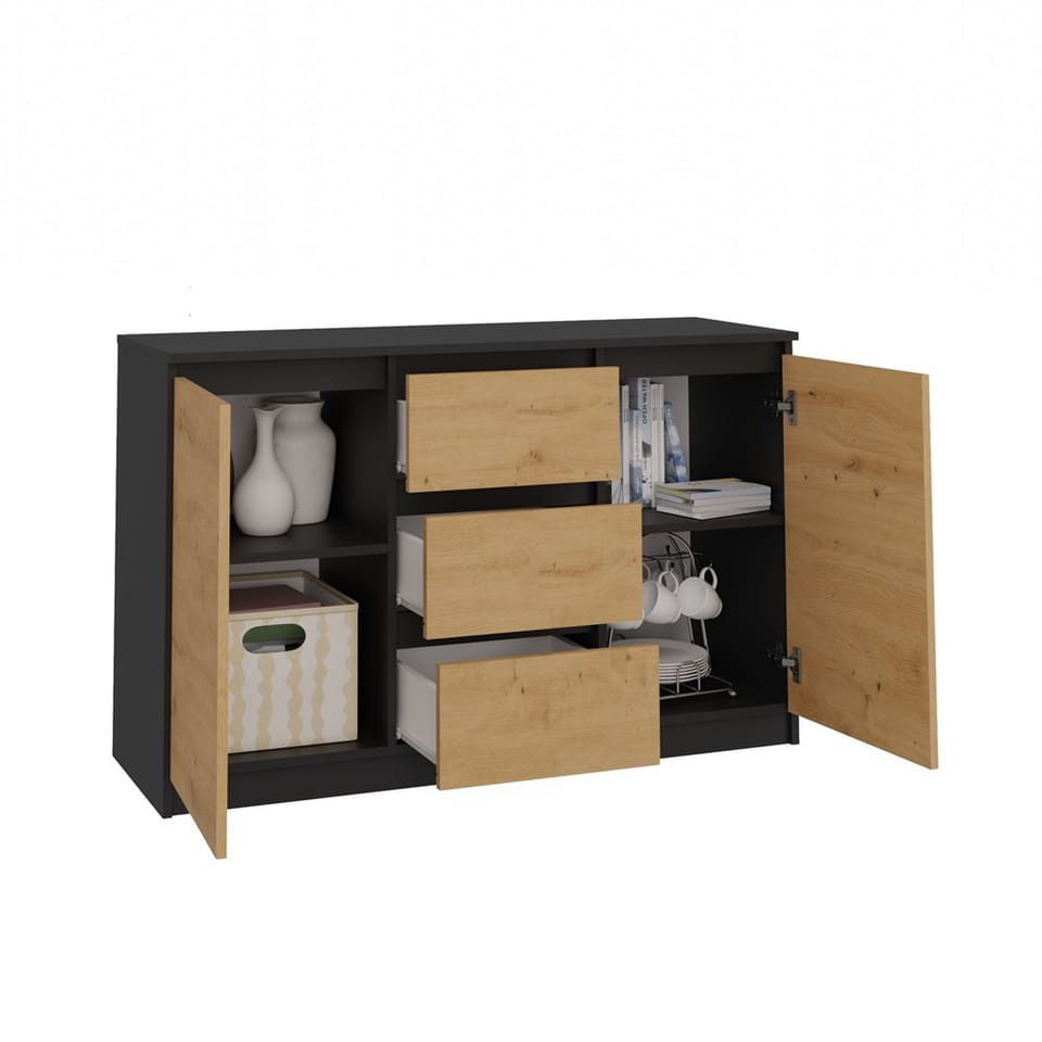 Wnętrze komody składa się z półek oraz trzech szuflad, które pomogą przy rozmieszczaniu rzeczy. Łatwiej będzie znaleźć to, czego się szuka.