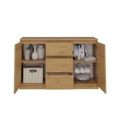 Wnętrze komody składa się z półek oraz trzech szuflad, które pomogą przy rozmieszczaniu rzeczy. Łatwiej będzie znaleźć to, czego się szuka.