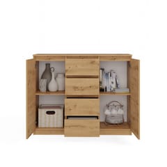 Wnętrze komody składa się z półek oraz czterech szuflad, które pomogą przy rozmieszczaniu rzeczy. Łatwiej będzie znaleźć to, czego się szuka.