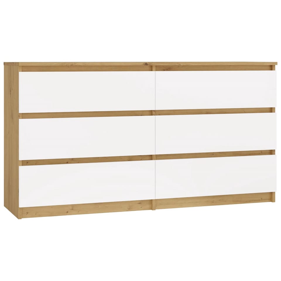 - Nowoczesny design – połączenie ciepłego odcienia dębu Artisan z białymi frontami nadaje komodzie elegancki i stylowy wygląd.