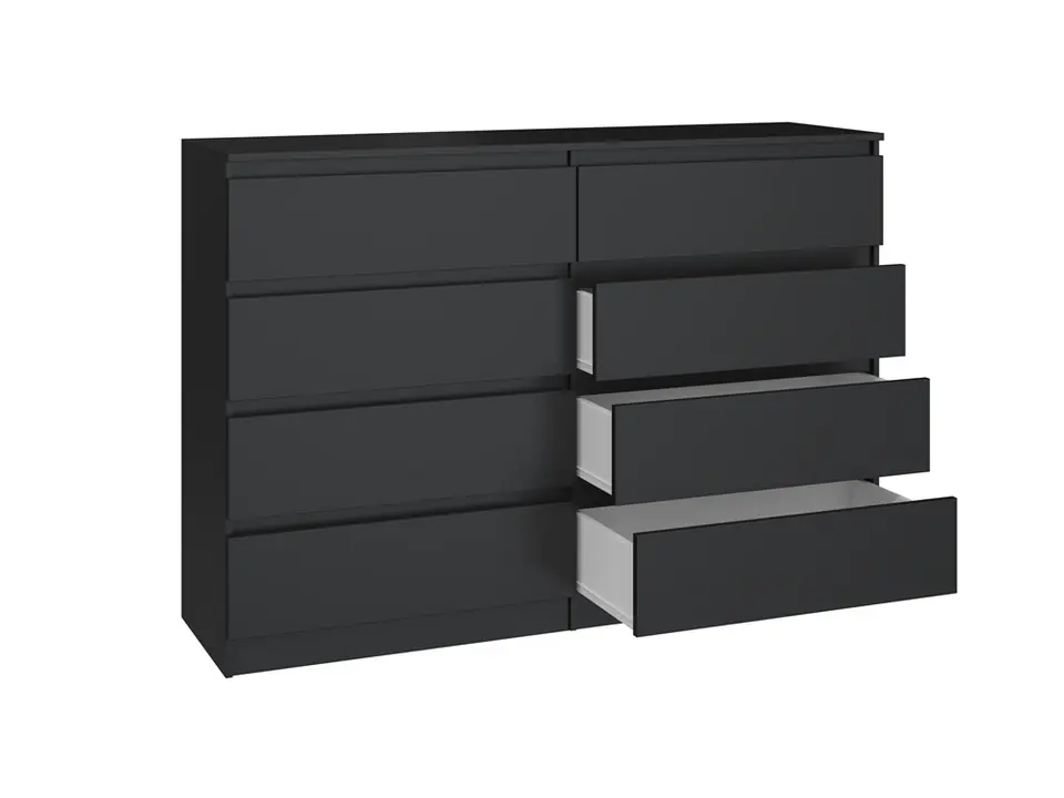NOWOCZESNA DUŻA KOMODA NA 8 SZUFLAD SERIA: MALWA MODEL: M8 140 KOLOR: CZERŃ Nowoczesna komoda z kolekcji MALWA to funkcjonalny i pakowny mebel, który urządzi wnętrze Twojej sypialni, salonu lub pokoju dziecka.