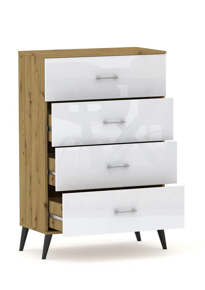 KOMODA POLA 4NNowoczesna komoda z serii POLA, stworzony dla ludzi, którzy cenią sobie nowoczesny styl i elegancję. Odnowi wnętrze każdego salonu, biura czy pokoju młodzieżowego. Konstrukcja jest minimalistyczna, ale solidna i trwała. Ergonomiczne wymiary zapewniają swobodne umeblowanie pomieszczenia. Wymiary komody: Wysokość: 117 cmSzerokość: 50 do 80 cm.Głebokość: 40 cmKomoda posiada 4 szuflady zamontowane na prowadnicach kulkowych z pełnym wysuwem. Wysokość frontu to aż 25,5 cm ! Nóżki sośne, drewniane w kolorze czarnym o wysokości 10 cm. Możliwość montażu komody bez nóżek. Wymiar użyteczny szuflady w środku:głębokość: 33 cmszerokość: 41/ 51/ 61/ 71/ cmwysokość boczku: 16 cm max wysokość przedmiotu który się zmieści w szufladzie 21 cm.