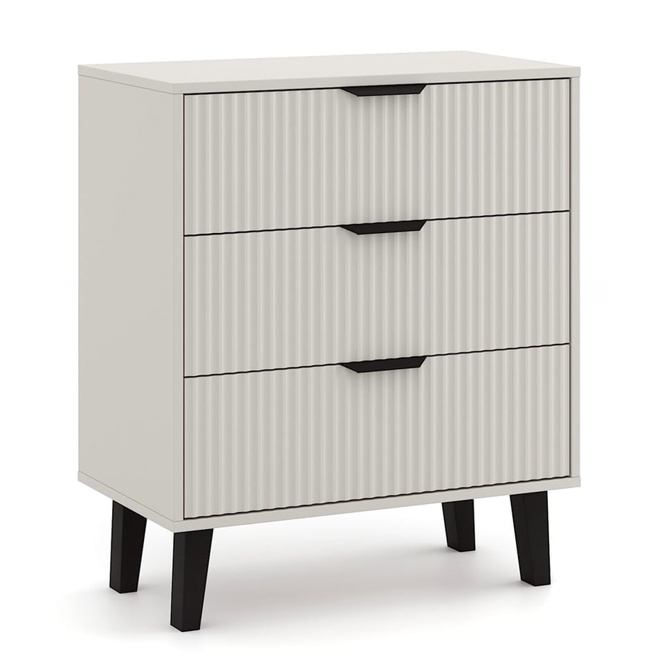 Komoda SCANDI 3S SLIM to idealna propozycja dla tych, którzy szukają praktycznego mebla do przechowywania z nutą nowoczesnego designu. Modny kolor Kaszmir w połączeniu z ryflowanymi frontami i wysokimi czarnymi nóżkami nadaje wnętrzu przytulności, a jednocześnie elegancji. Dzięki pojemnym szufladom z łatwością pomieścisz odzież, akcesoria, dokumenty czy inne drobiazgi, zachowując porządek i estetykę w sypialni, przedpokoju, salonie lub pokoju młodzieżowym. To kompaktowy, a zarazem pojemny mebel, który odnajdzie się zarówno w mniejszych, jak i większych przestrzeniach.