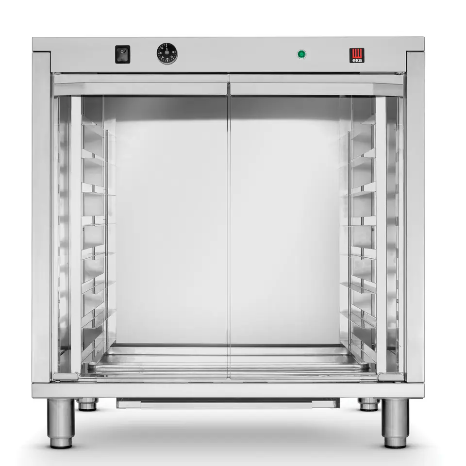 Numer producenta: 225967Komora rozrostu wyposażona w sterowanie manualne to idealne rozwiązanie dla piekarni, do rozrostu surowego ciasta. Urządzenie może również pełnić rolę podstawy pod piec.Cechy produktu:– modułowy kształt urządzenia pozwala na zestawienie w szeregu większej ilości urządzeń wraz z piecami– pozwala na oszczędność miejsca oraz prezentację świeżo wypiekanego pieczywa– ze stali nierdzewnej AISI 430– prowadnice na blachy cukiernicze 600×400 mm– przeszklone drzwi skrzydłowe– temperatura sterowana termostatem, 2 grzałki każda po 1,2 kW– pojemność komory 8 blach x 600x400 mm– termostat elektromechaniczny +30deg;C do +60deg;C– pasuje do pieców Hendi nr 225516, 225523, 225059Brak pojemników GN w zestawie!Parametry:– moc: 2400W– napięcie: 230V– odległość między prowadnicami 70 mm– wymiary zewnętrzne 795x655x(H)835 mm– waga 43,6 kgW zestawie:– komora rozrostu– instrukcja PL