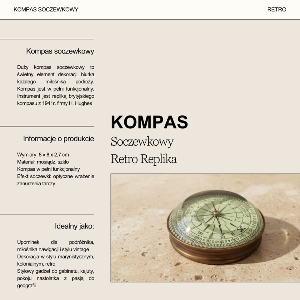 Kompas Soczewkowy Mosiężny – Retro Replika - NC2511 Duży kompas soczewkowy to świetny element dekoracji biurka każdego miłośnika podróży. Będzie doskonałą dekoracją kajuty lub pokoju w stylu marynistycznym. Kompas sprawdzi się jako ciekawy przycisk do papieru. Kompas jest w pełni funkcjonalny. Instrument jest repliką brytyjskiego kompasu z 1941r. firmy H. Hughes Obudowa kompasu wykonana jest z mosiądzu. Na podstawie piękne przysłowie: "A thousand mile journey begins with a single step" - "Tysiącmilowa podróż zaczyna się od pierwszego kroku". Zastosowanie soczewki sprawia wrażenie, że tarcza jest zanurzona w cieczy. Tarcza kompasu funkcjonuje jako igła magnetyczna. Informacje o produkcie: ·Wymiary: 8 x 8 x 2,7 cm ·Materiał: mosiądz, szkło ·Kompas w pełni funkcjonalny ·Efekt soczewki: optyczne wrażenie zanurzenia tarczy ·Kolorystyka: mosiężny, czarny, beżowy ·Igła magnetyczna: rolę pełni tarcza kompasu ·Napisy: czarne ·Napis: „A thousand mile journey begins with a single step” Idealnie sprawdzi się jako: ?Upominek dla podróżnika, miłośnika nawigacji i stylu vintage ?Dekoracja w stylu marynistycznym, kolonialnym, retro ?Stylowy gadżet do gabinetu, kajuty, pokoju nastolatka z pasją do geografii ?Narzędzie edukacyjne do nauki podstaw orientacji