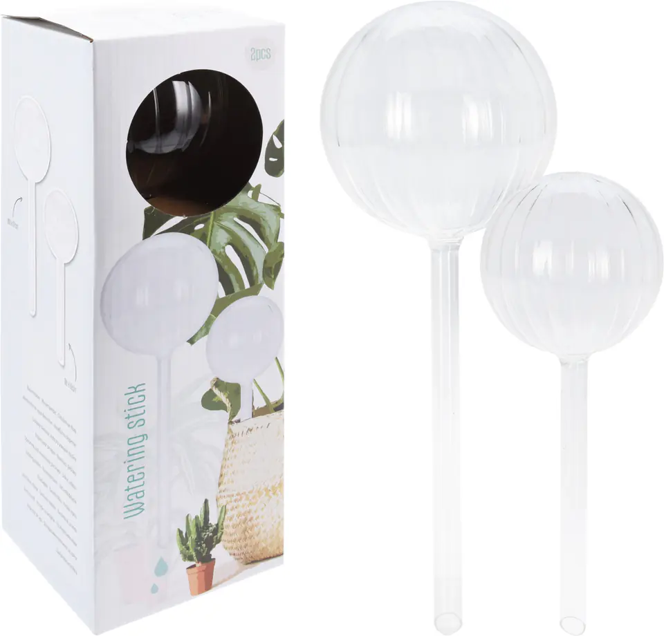 Zestaw 2 sztuk szklanych nawadniaczy do kwiatów w kształcie dekoracyjnych kul. Doskonale nadają się do nawadniania roślin przez dłuższy czas, nawet do 2 tygodni. Kontrolowane uwalnianie wody do ziemi zapewnia roślinom odpowiednie nawilżenie nawet w czasie Twojej nieobecności. Teraz spokojnie możesz wyjechać na urlop wiedząc, że kule ochronią kwiaty przed przesuszeniem oraz obumarciem. Produkt ten jest bardzo łatwy w użyciu. Wystarczy zrobić wgłębienie w ziemi w miejscu, gdzie będzie nawadniacz, następnie całkowicie wypełniony wodą umieścić pionowo w ziemi. Oprócz praktycznej funkcji, nawadniacze pełnią również rolę dekoracyjną. Ozdobne, szklane kule pięknie prezentują się w doniczkach z zielonymi roślinami. Wymiary: Kula duża: 10 cm x 10 cm x h27 cm Kula mała: 8 cm x 8 cm x h19 cm