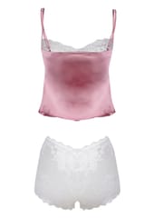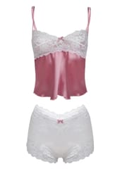 KOMPLET SKŁADA SIĘ Z KOSZULKI I BOKSEREK GÓRĘ KOSZULKI TWORZĄ PROFILOWANE MISECZKI Z ELASTYCZNEJ KORONKI DÓŁ KOSZULKI JEST SATYNOWY RAMIACZKA CIENKIE I REGULOWANE BOKSERKI NA CIENKIEJ GUMCE CAŁE USZYTE Z ELASTYCZNEJ KORONKI