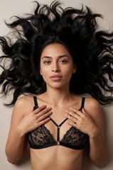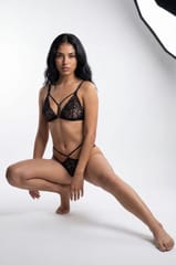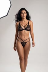Seksowny komplet bielizny wykonany z połączenia czarnej koronki i modnych, cienkich pasków. Biustonosz z miseczkami typu soft, bez fiszbin, kusi świetnie podkreślonym dekoltem. Ma elastyczny obwód o regulowanej długości oraz ramiączka, których długość również można wyregulować. Stringi typu "open" wyglądają hipnotyzująco - paski zdobią pośladki w spektakularny sposób, zaś sam fason zdecydowanie pobudza męskie zmysły... Skład: 80% poliamid, 20% elastan.