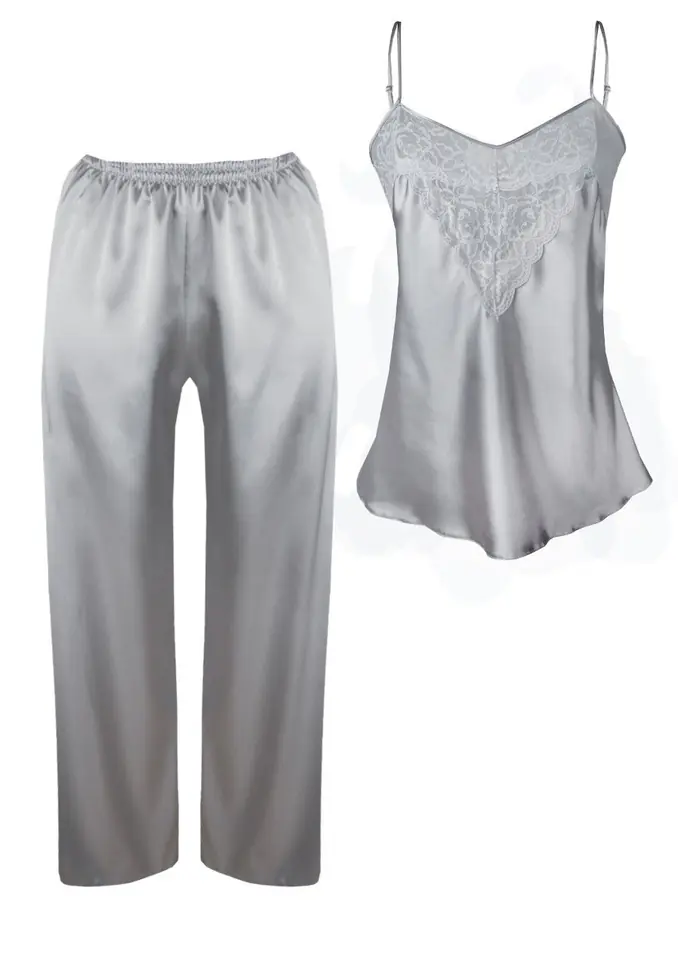 Stylowa, satynowa piżama w srebrnym kolorze. Rozpocznij wieczór od czegoś wyjątkowego! Miękka satyna wysokiej jakości obdarzona subtelnym, perłowym blaskiem w duecie z lekko opaloną skórą zaprezentuje się szlachetnie, zaś biała, urocza koronka od razu podkreśli Twoją kobiecość. Zestaw zawiera bluzeczkę na cienkich, regulowanych ramiączkach oraz długie spodnie na miękkiej gumce. Skład: 100% poliester.
