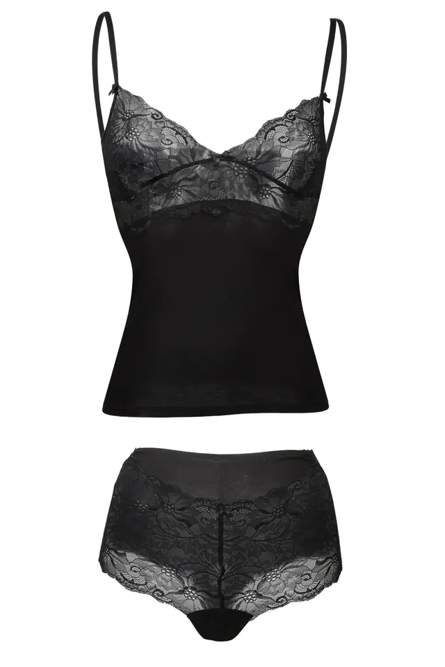 WYGODNY KOMPLECIK WYKONANY Z DELIKATNEJ DLA SKÓRY WISKOZY. KOSZULKA Z DELIKATNEJ WISKOZOWEJ TKANINY Z UROCZĄ KORONKĄ NA BIUŚCIE. BOKSERKI OBSZYTE KORONKĄ NA PRZODZIE, TYŁ Z TEJ SAMEJ WISKOZOWEJ TKANINY.
