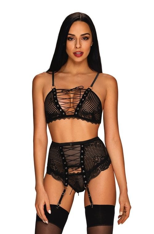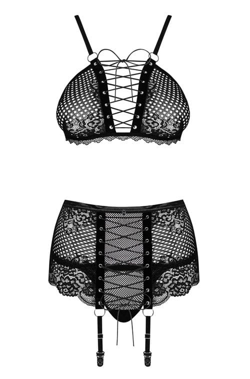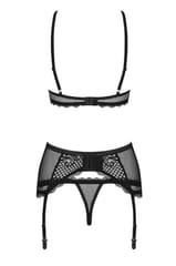 - Podkreśl swoją kobiecość! Jak? W tej trzyczęściowej bieliźnie będziesz wyglądać szalenie zmysłowo. Komplet wykonano z przyjemnej w dotyku, elastycznej dzianiny, która idealnie dopasowuje się do ciała. Jej wzór to efektowne połączenie drobnych oczek i kwiecistych zdobień, które wspólnie zestawiono z sexy sznurowaniem. Biustonosz o miękkich miseczkach bez fiszbin, pas do pończoch o nieco pełniejszej, uwodzicielskiej formie. Stringi w komplecie. Skład: 90% poliamid, 10% elastan.