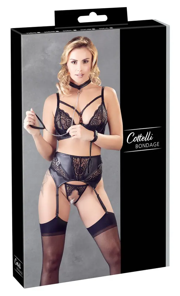 3-częściowy komplet bielizny do pończoch wykonany z matowej tkaniny połączonej z koronką. Biustonosz usztywniony fiszbinami przyciąga wzrok regulowanymi paseczkami i ozdobnymi pierścieniami w okolicy dekoltu. Koronkowe miseczki można złożyć. Pas do pończoch ma regulowane paski do pończoch i urzekający przód ze srebrnymi pierścieniami i koronkowymi wstawkami. W zestawie również stringi bez krocza z 2 paskami, które idealnie podkreślają obszar krokowy, kajdanki (zapięcie na rzep) z krótkim paskiem łączącym, kołnierz (zapięcie na rzep) i smycz. Skład: 90% poliester, 10% elastan; koronka 90% poliamid, 10% elastan.