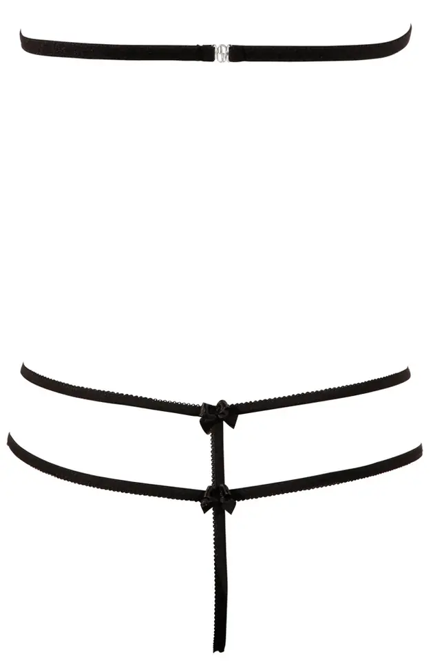 Delikatny biustonosz z odchylaną miseczką. Stringi z otwartym kroczem. Czarny. 100% poliamid.