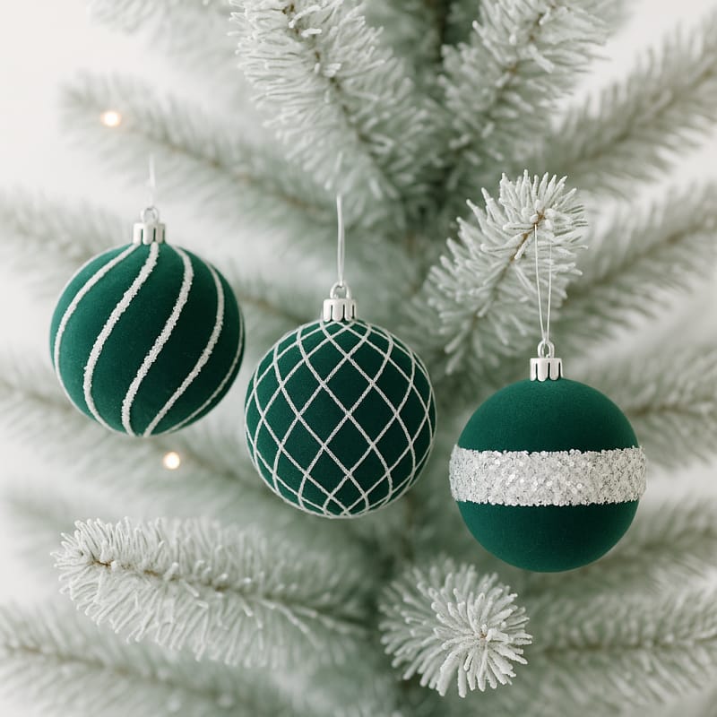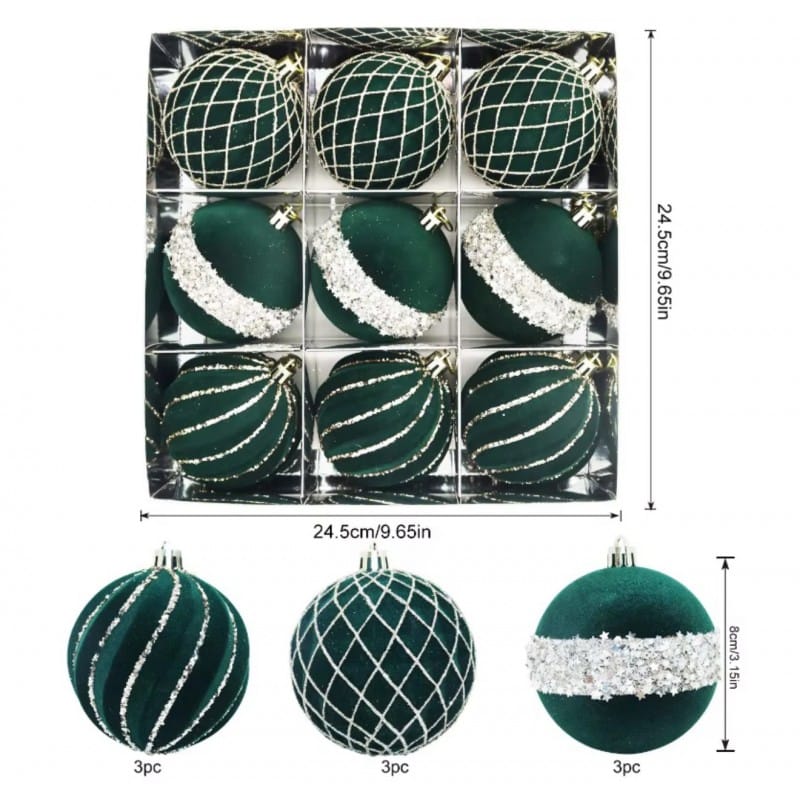 Komplet bombek bożonarodzeniowych 9 szt. w opakowaniu, welurowe zielone, średnica 8cm BSN68