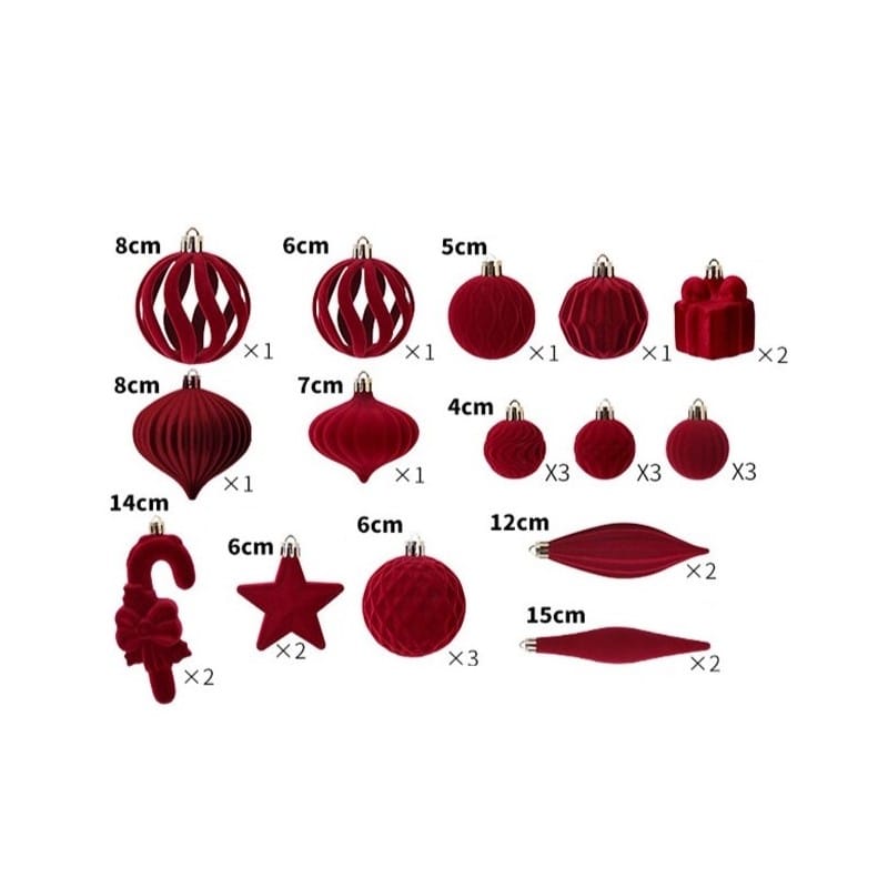 Zestaw 28 sztuk bombek na choinkęDzięki nim magia Świąt Bożego Narodzenia jest jeszcze większa! Specyfikacja:Zestaw 28 sztukSpakowane w pudełeczkoKolor: bordoweŚrednica/ długość: od 4cm do 14cm Materiał: tworzywo sztuczne Wymiary opakowania: Waga: Poczuj klimat Świąt!