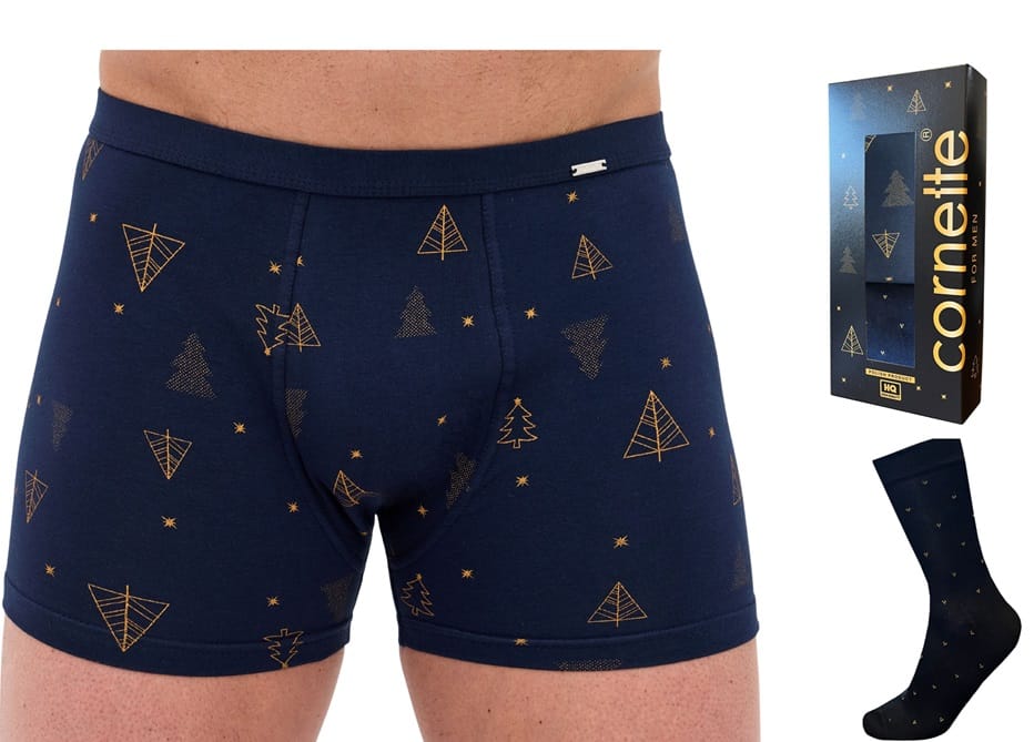 Komplet męski składający się z szortów i skarpet wykonanych z wysokiej jakości bawełny, ozdobionych świątecznym nadrukiem. Pakowane w ozdobne pudełko, idealne na prezent.Skład: szorty 95% bawełna, 5% elastan, skarpety 74% bawełna, 23% poliamid, 3% elastan