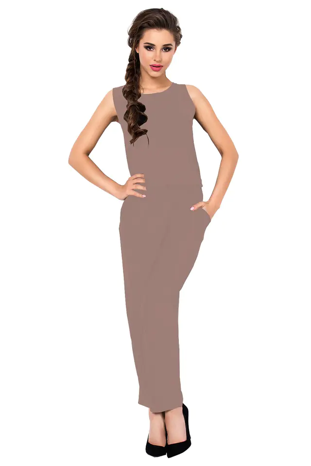 STYLOWY DAMSKI KOMBINEZON Z DŁUGIMI SPODNIAMI, WYKONANY Z DELIKATNEJ W DOTYKU WISKOZOWEJ DZIANINY. W PASIE ODCIĘTY GUMKĄ,KTÓRA POZWALA NA ODPOWEDNIE DOPASOWANIE PO BOKACH DWIE KIESZONKI. GÓRA KOMBINEZONU NA SZERSZYCH RAMIĄCZKACH, ZAPINANY Z TYŁU GUZIKIEM.