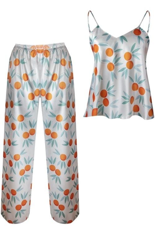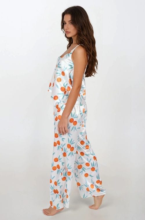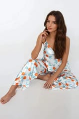 Wygodna, dwuczęściowa piżama wykonana z miękkiej, drukowanej satyny. Zaprojektowana tak aby podkreślić linię biustu, oczarować delikatnym dekoltem i ślicznymi, cieniutkimi ramiączkami, których długość można regulować. Spodnie długie o komfortowych nogawkach, na miękkiej gumce w pasie. Skład: 100% poliester.