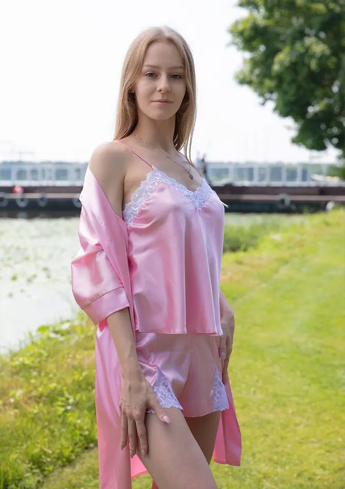 Słodki, dwuczęściowy komplecik wykonany z satyny i koronki. Z pewnością oczaruje Cię zarówno swym delikatnym, pastelowym kolorem jak i niesamowitą subtelnością wpisaną w ten projekt. Komplecik składa się z wygodnej bluzeczki na cienkich, regulowanych ramiączkach, z pięknym, koronkowym dekoltem oraz luźnych szortów na miękkiej gumce, z koronką jako wstawką na udach. Skład: 100% poliester.