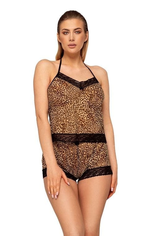 Ekskluzywna, dwuczęściowa piżama wykonana z niezwykle miękkiej, zwiewnej, elastycznej tkaniny, która wspaniale układa się na ciele. Motyw kocich cętek wabi spojrzenie a piękna, ciepła kolorystyka sprawia, że w tej kompozycji można poczuć się seksownie i niesamowicie kobieco. Brzegi obszyte delikatną, czarną koronką. Góra o luźnym kroju, wiązana na szyi. Szorty na miękkiej gumce, z kokardką w pasie. Skład: 80% poliamid, 20% elastan.