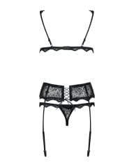 - 3 części – kuszący stanik, pikantny pas do pończoch oraz stringi. Wszystkie elementy kompletu z gustowną, kwiatową aplikacją i koronkowym wykończeniem