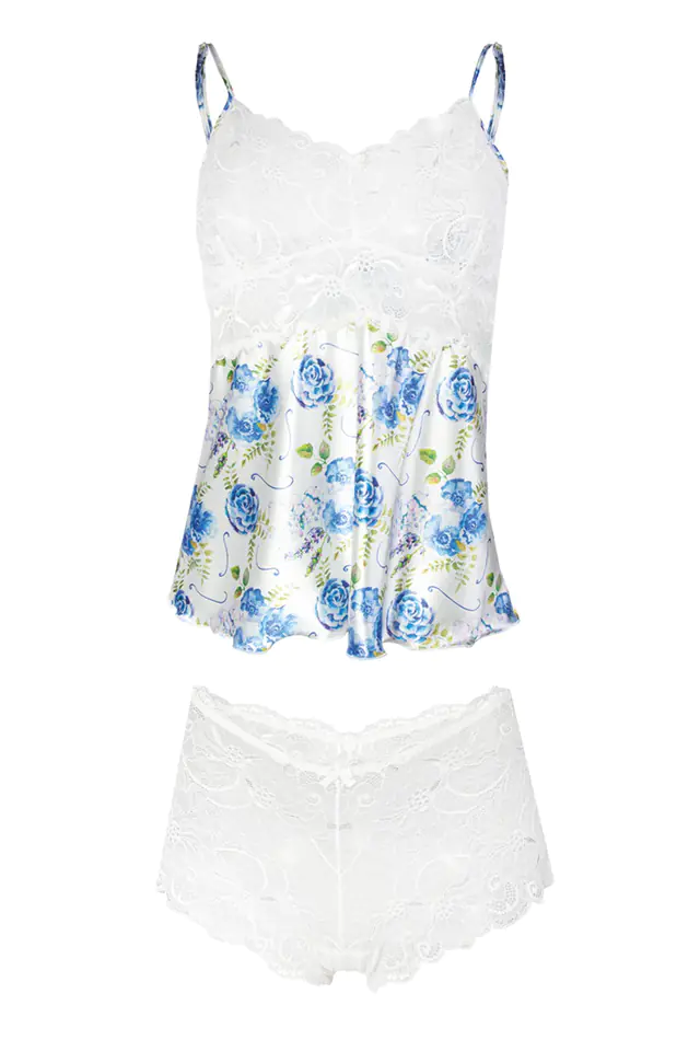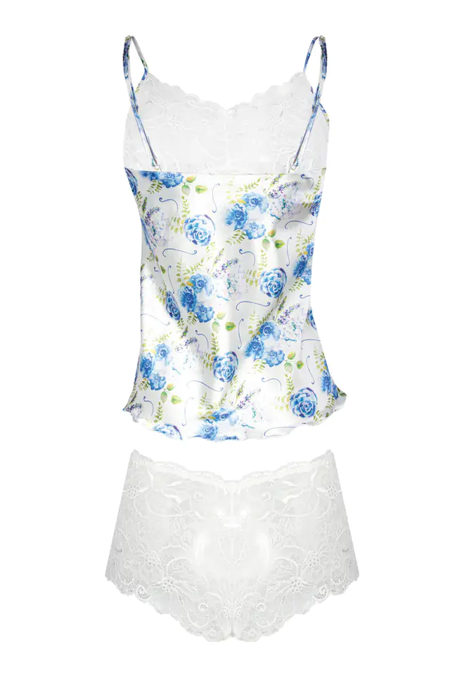 Coś kuszącego dla Dam. Seksowny, zmysłowy dwuczęściowy komplet składający się z: koszulki oraz bokserek. Góra koszulki uszyta z elastycznej zmysłowej koronki. Dół natomiast został wykonany z delikatnej drukowanej wzorzystej satyny. Ramiączka cienkie, regulowane. Bokserki zostały wykonane z delikatnej koronki, która z całością tworzy niezapomniany komplecik. Dostępne w 11 wzorach. Koronka uzależniona od wzoru drukowanej satyny, występuje w kolorach: bieli, granatu oraz czarnego. Kuś swoim pięknem.