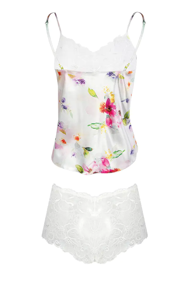 Coś kuszącego dla Dam. Seksowny, zmysłowy dwuczęściowy komplet składający się z: koszulki oraz bokserek. Góra koszulki uszyta z elastycznej zmysłowej koronki. Dół natomiast został wykonany z delikatnej drukowanej wzorzystej satyny. Ramiączka cienkie, regulowane. Bokserki zostały wykonane z delikatnej koronki, która z całością tworzy niezapomniany komplecik. Dostępne w 11 wzorach. Koronka uzależniona od wzoru drukowanej satyny, występuje w kolorach: bieli, granatu oraz czarnego. Kuś swoim pięknem.