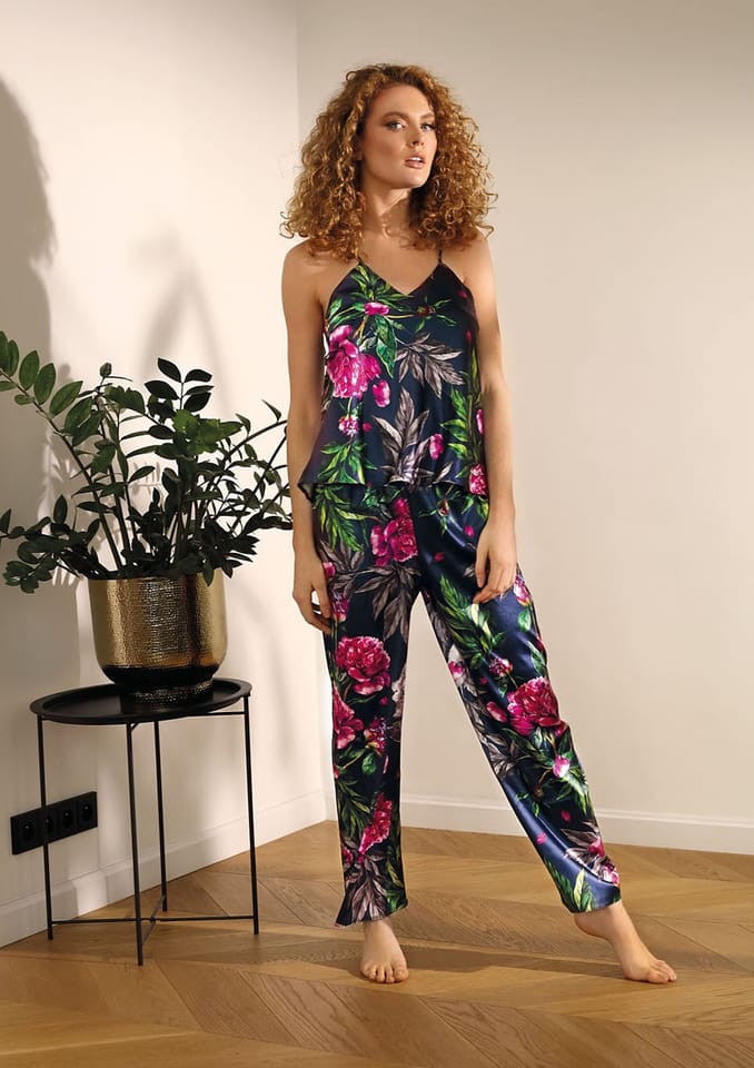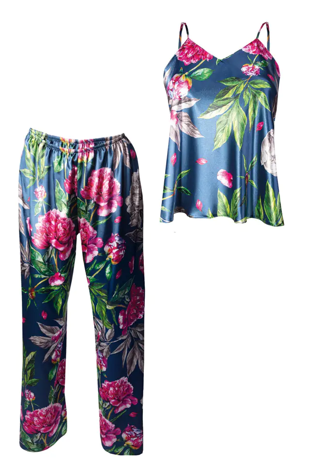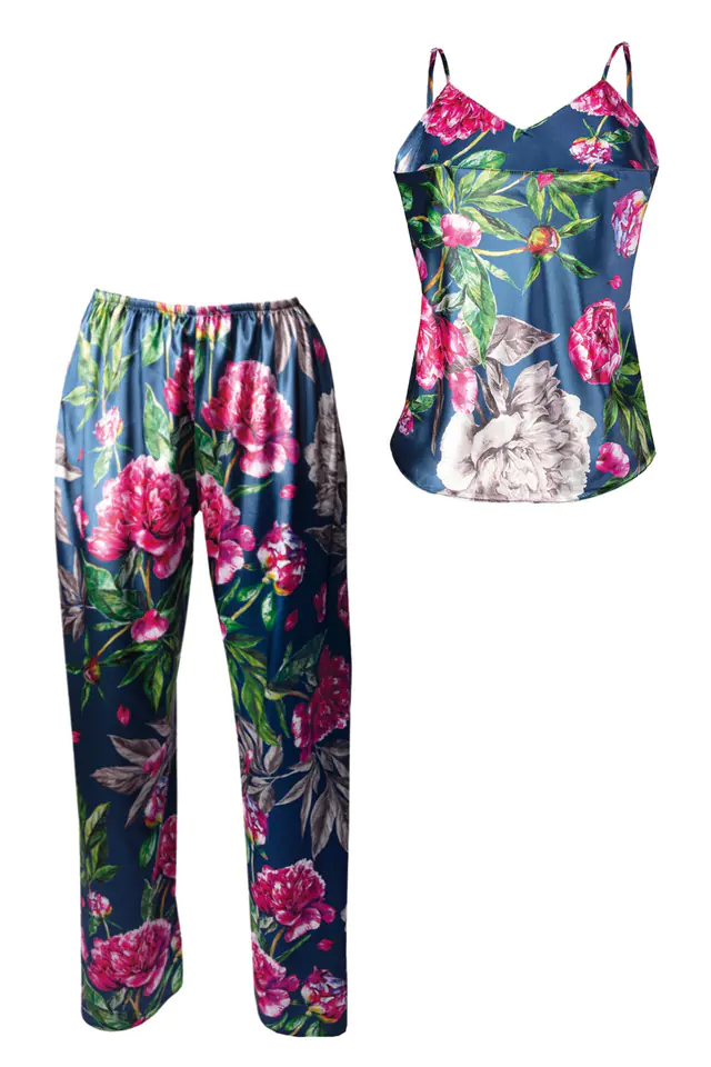 Satynowa piżamka z długimi spodniami w kwiaty Flowers DK-KI. Prosty, zmysłowy dwuczęściowy komplet składający się z koszulki oraz długich spodni. Odważny dekolt w kształcie litery „V”, który jest niezwykle kuszący. Góra koszulki wykonana z drukowanej wzorzystej satyny. Wąskie ramiączka z regulacją zapewnią Tobie poczucie komfortu podczas snu. Spodnie proste, długie satynowe na cienkiej gumce dodające elegancji. Dostępna w 11 wzorach. Pozwól sobie na odrobinę elegancji.Szukasz czegoś dziewczęco, a jednocześnie chciałabyś bieliznę, w której będziesz kusić swojego ukochanego? Co powiesz na ten komplet z kolekcji Flowers? Prosty, a zarazem zmysłowy. Składa się z satynowej koszulki na cienkich ramiączkach oraz długich satynowych spodni. Koszulka posiada odważny dekolt w kształcie litery “V”, który pięknie wyeksponuje biust. Wąskie ramiączka zapewnią Ci wygodę oraz poczucie komfortu podczas snu, a ich możliwość regulowania pozwoli Ci dopasować bieliznę do Twoich kształtów. Komplet Flowers dostępny jest w aż kilkunastu różnych wzorach i kolorach. Wybierz komplecik, który najbardziej Ci się podoba i pozwól sobie na odrobinę elegancji. W przypadku jakichkolwiek pytań, skontaktuj się z nami. Z przyjemnością na nie odpowiemy oraz rozwiejemy wszelkie wątpliwości dotyczące zakupu bielizny przez internet. Skład surowcowy: poliester 100%. Jak prać i prasować? Taki materiał najlepiej prać ręcznie w temperaturze 30°C. Proszę nie chlorować, nie czyścić chemicznie i nie wirować. Prasować w temperaturze 110°C.
