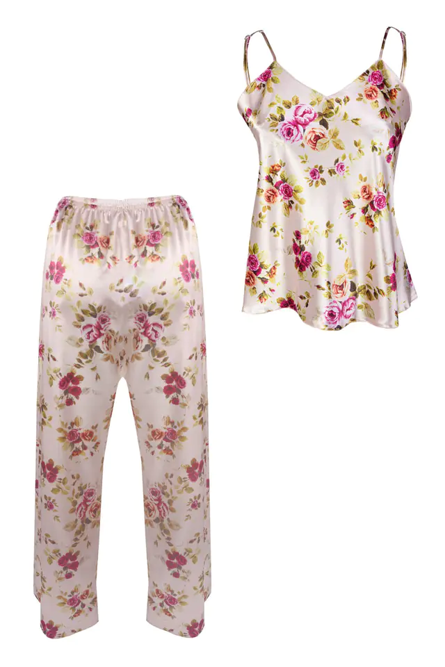 Satynowa piżamka z długimi spodniami w kwiaty Flowers DK-KI. Prosty, zmysłowy dwuczęściowy komplet składający się z koszulki oraz długich spodni. Odważny dekolt w kształcie litery „V”, który jest niezwykle kuszący. Góra koszulki wykonana z drukowanej wzorzystej satyny. Wąskie ramiączka z regulacją zapewnią Tobie poczucie komfortu podczas snu. Spodnie proste, długie satynowe na cienkiej gumce dodające elegancji. Dostępna w 11 wzorach. Pozwól sobie na odrobinę elegancji.Szukasz czegoś dziewczęco, a jednocześnie chciałabyś bieliznę, w której będziesz kusić swojego ukochanego? Co powiesz na ten komplet z kolekcji Flowers? Prosty, a zarazem zmysłowy. Składa się z satynowej koszulki na cienkich ramiączkach oraz długich satynowych spodni. Koszulka posiada odważny dekolt w kształcie litery “V”, który pięknie wyeksponuje biust. Wąskie ramiączka zapewnią Ci wygodę oraz poczucie komfortu podczas snu, a ich możliwość regulowania pozwoli Ci dopasować bieliznę do Twoich kształtów. Komplet Flowers dostępny jest w aż kilkunastu różnych wzorach i kolorach. Wybierz komplecik, który najbardziej Ci się podoba i pozwól sobie na odrobinę elegancji. W przypadku jakichkolwiek pytań, skontaktuj się z nami. Z przyjemnością na nie odpowiemy oraz rozwiejemy wszelkie wątpliwości dotyczące zakupu bielizny przez internet. Skład surowcowy: poliester 100%. Jak prać i prasować? Taki materiał najlepiej prać ręcznie w temperaturze 30°C. Proszę nie chlorować, nie czyścić chemicznie i nie wirować. Prasować w temperaturze 110°C.