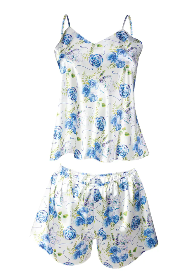 Zmysłowy, zwiewny dwuczęściowy komplet składający się z koszulki oraz krótkich spodenek, podbije serce każdej kobiety. Odważny dekolt w kształcie litery „V”, który jest niezwykle kuszący. Góra koszulki wykonana z drukowanej wzorzystej satyny. Ramiączka cienkie, regulowane. Spodnie krótkie satynowe na cienkiej gumce dodające seksapilu. Dostępna w 11 wzorach. Zapewnij sobie troszkę urozmaicenia na letnie wieczory.