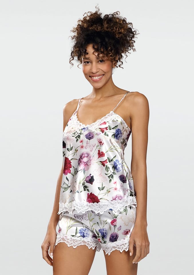 Prosty fason zachwyci Cię swoją delikatnością. Ten dwuczęściowy komplet bielizny nocnej pozwoli poczuć się jak bogini nocy. Wąskie ramiączka z regulacją zapewnią Tobie poczucie komfortu podczas snu. Przód koszulki tworzą dopasowane, trójkątne miseczki ozdobione delikatną koronką. Spodenki uszyte na niskim stanie. Całość dopełnia eleganckie obszycie. Dostępne w 11 wzorach. Koronka dopasowana do druku satyny. W odcieniu: czarnego oraz ecru. Zapewnij sobie niezapomnianą noc.