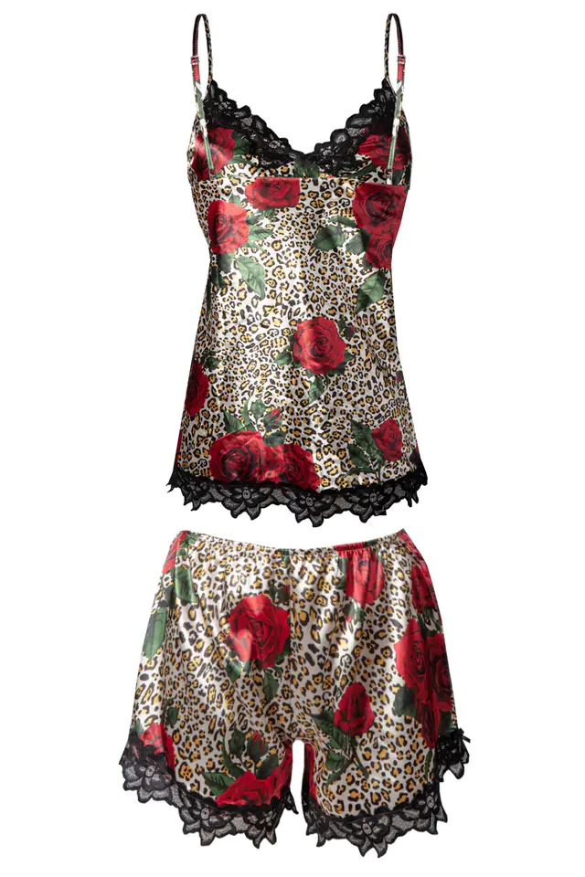 Prosty fason zachwyci Cię swoją delikatnością. Ten dwuczęściowy komplet bielizny nocnej pozwoli poczuć się jak bogini nocy. Wąskie ramiączka z regulacją zapewnią Tobie poczucie komfortu podczas snu. Przód koszulki tworzą dopasowane, trójkątne miseczki ozdobione delikatną koronką. Spodenki uszyte na niskim stanie. Całość dopełnia eleganckie obszycie. Dostępne w 11 wzorach. Koronka dopasowana do druku satyny. W odcieniu: czarnego oraz ecru. Zapewnij sobie niezapomnianą noc.