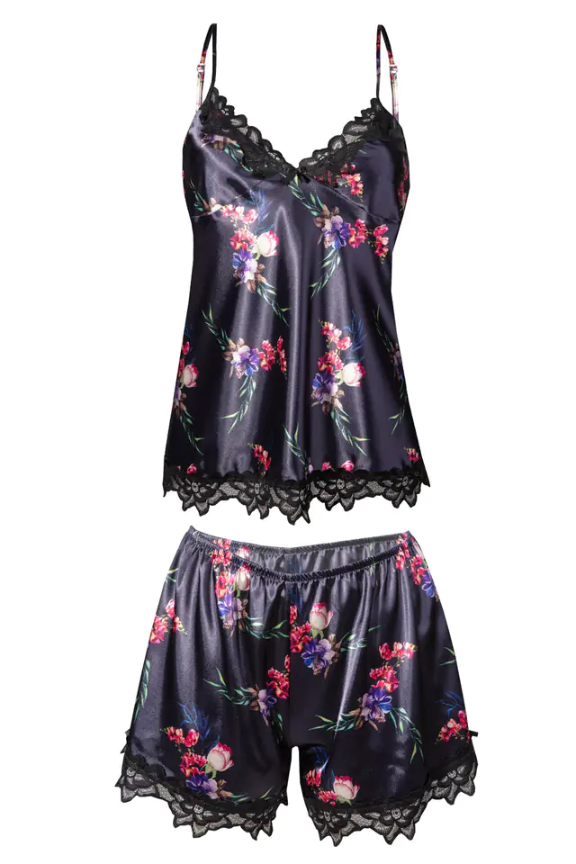 Prosty fason zachwyci Cię swoją delikatnością. Ten dwuczęściowy komplet bielizny nocnej pozwoli poczuć się jak bogini nocy. Wąskie ramiączka z regulacją zapewnią Tobie poczucie komfortu podczas snu. Przód koszulki tworzą dopasowane, trójkątne miseczki ozdobione delikatną koronką. Spodenki uszyte na niskim stanie. Całość dopełnia eleganckie obszycie. Dostępne w 11 wzorach. Koronka dopasowana do druku satyny. W odcieniu: czarnego oraz ecru. Zapewnij sobie niezapomnianą noc.