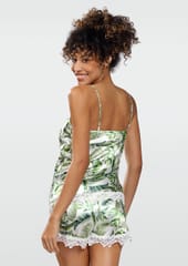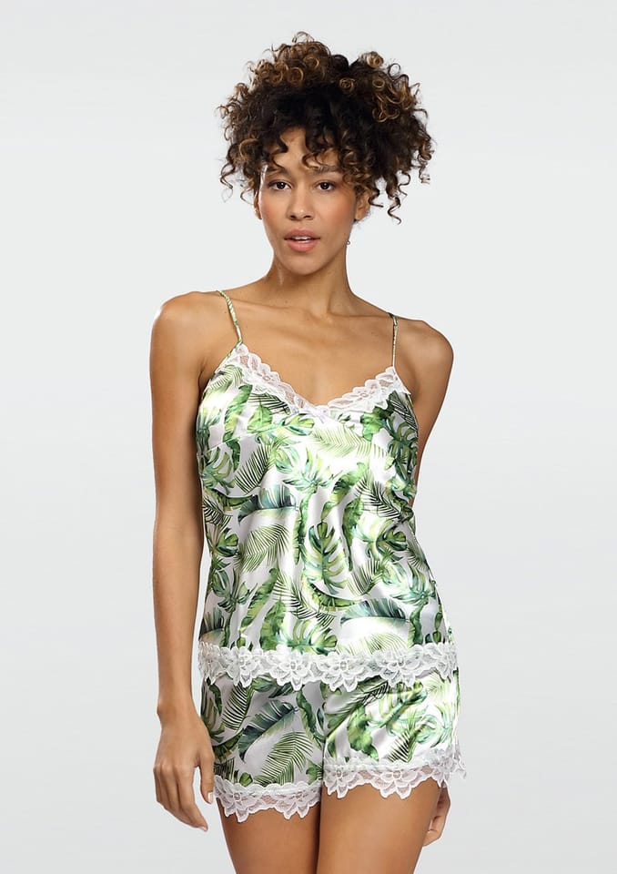 Prosty fason zachwyci Cię swoją delikatnością. Ten dwuczęściowy komplet bielizny nocnej pozwoli poczuć się jak bogini nocy. Wąskie ramiączka z regulacją zapewnią Tobie poczucie komfortu podczas snu. Przód koszulki tworzą dopasowane, trójkątne miseczki ozdobione delikatną koronką. Spodenki uszyte na niskim stanie. Całość dopełnia eleganckie obszycie. Dostępne w 11 wzorach. Koronka dopasowana do druku satyny. W odcieniu: czarnego oraz ecru. Zapewnij sobie niezapomnianą noc.