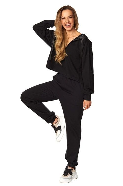 Świetny, dwuczęściowy komplet wykonany z wysokiej jakości bawełny, który szybko stanie się Twoją ulubioną pozycją w garderobie. Mięciutki i wysoce komfortowy, dopieszczony w każdym szczególe, a do tego niesamowicie kobiecy. Góra to bluza z długim rękawem i kapturem podszytym piękną, srebrną satyną. V-dekolt kusząco eksponuje wdzięki. Spodnie długie, z kieszonkami po bokach, nogawki wykończone elastyczną gumką. Klasyczna czerń. Skład: 100% bawełna wysokiej jakości.