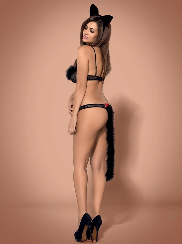 Jak wygonić nudę z Waszego związku? Zaskocz swojego faceta tym kuszącym wdziankiem! Oto body typu monokini, w intrygującym, czarnym kolorze, z kocimi cętkami na tkaninie, słodkim, puchatym, odpinanym ogonkiem i opaską z uszkami. Piersi podkreśli profilowana konstrukcja na fiszbinach z czerwoną kokardką na środku i puszkiem na dekolcie. So sexy! Skład: 94% poliamid, 6% elastan.
