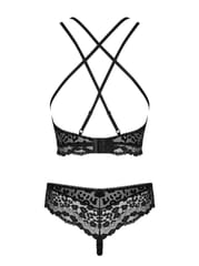 Dwuczęściowy, czarny komplet bielizny wykonany z elastycznej tkaniny z motywem czarnej panterki. W zestawie top z tyłem na cienkich, regulowanych paskach, w opcji na krzyż oraz wygodne stringi. Całość świetnie zaprezentuje się w sypialni a top dodatkowo doskonale uzupełni np. jeansy. Tkanina z delikatnym prześwitem, miękka i elastyczna. Miseczki profilowane, bez fiszbin. Figi z delikatną, koronkową górą. Skład: 90% poliamid, 10% elastan.