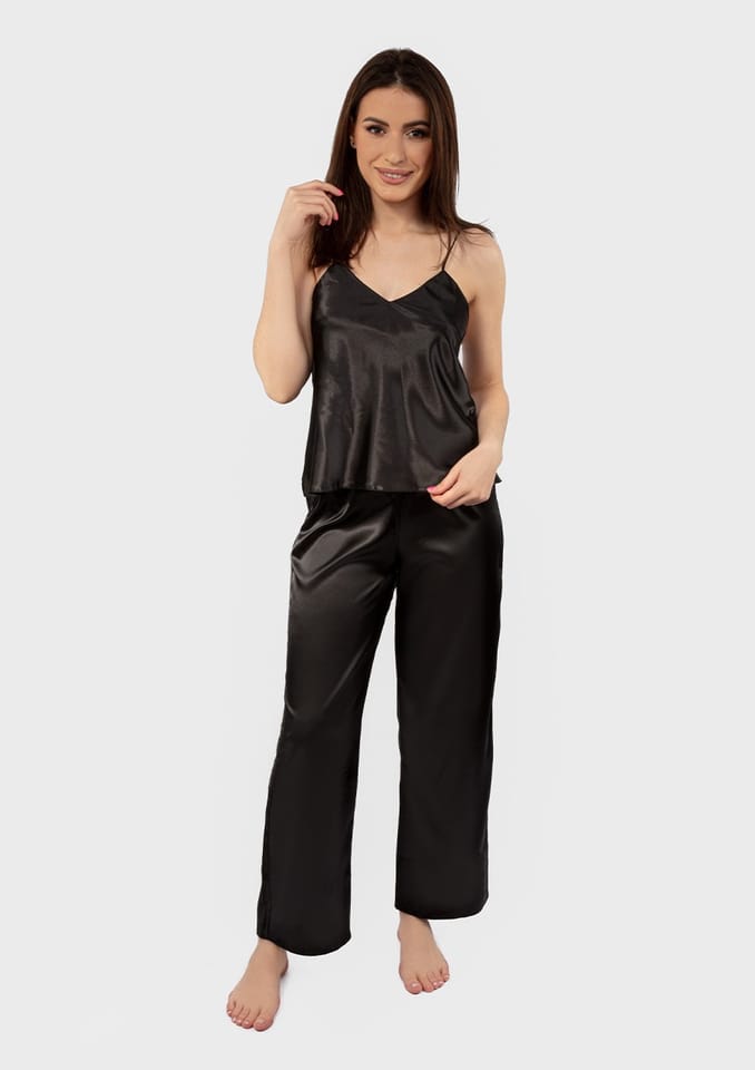 KOMPLET SKŁADA SIĘ Z KOSZULKI ORAZ DŁUGICH SPODNIPRZÓD KOSZULKI TWORZY TRÓJKĄTNY DEKOLTSPODENKI NA GUMCECAŁOŚĆ USZYTA Z SATYNYRAMIĄCZKA CIENKIE I REGULOWANE